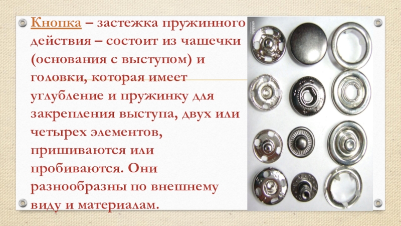 Слайд 9Кнопка – застежка пружинного действия – состоит из чашечки (основания с