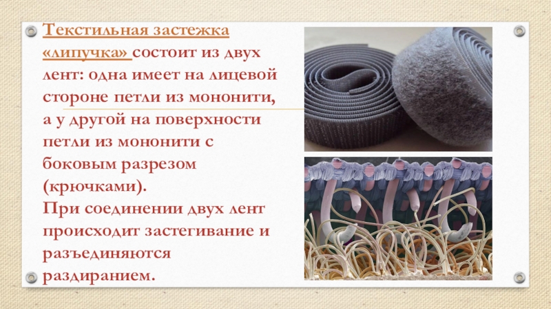 Слайд 12Текстильная застежка «липучка» состоит из двух лент: одна имеет на лицевой