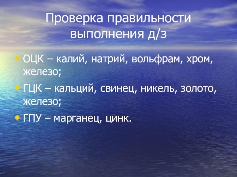 Проверка правильности выполнения д/з ОЦК – калий, натрий, вольфрам, хром, железо;ГЦК – кальций, свинец, никель, золото, железо;
