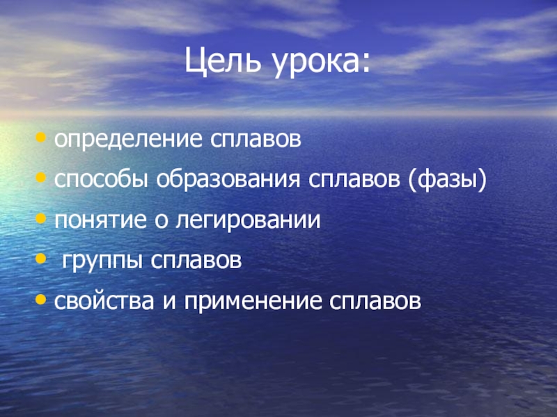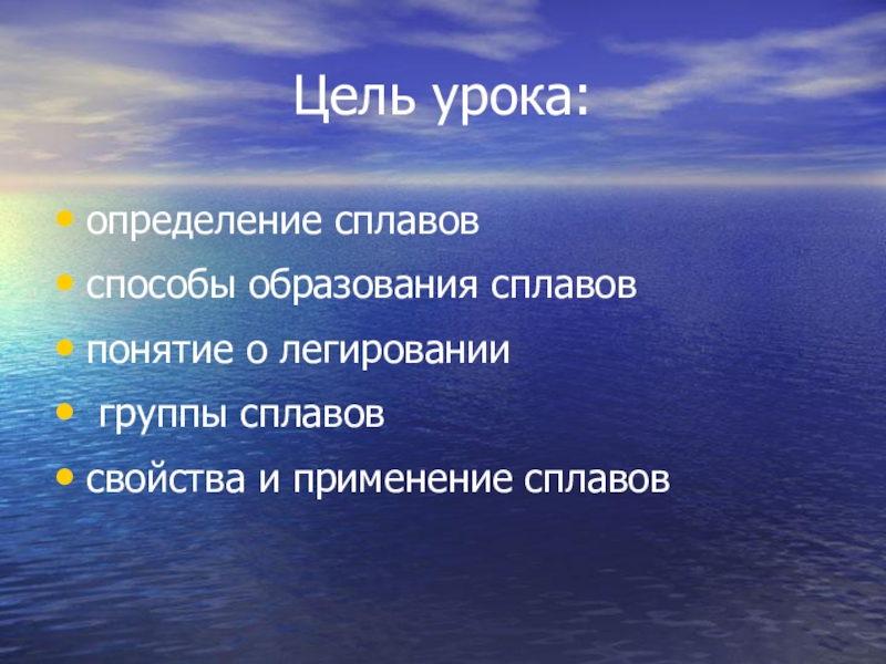 Цель урока:определение сплавовспособы образования сплавовпонятие о легировании группы сплавовсвойства и применение сплавов