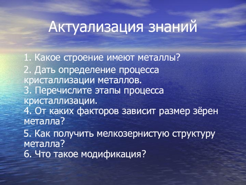 Актуализация знаний  1. Какое строение имеют металлы?  2. Дать определение процесса кристаллизации металлов.