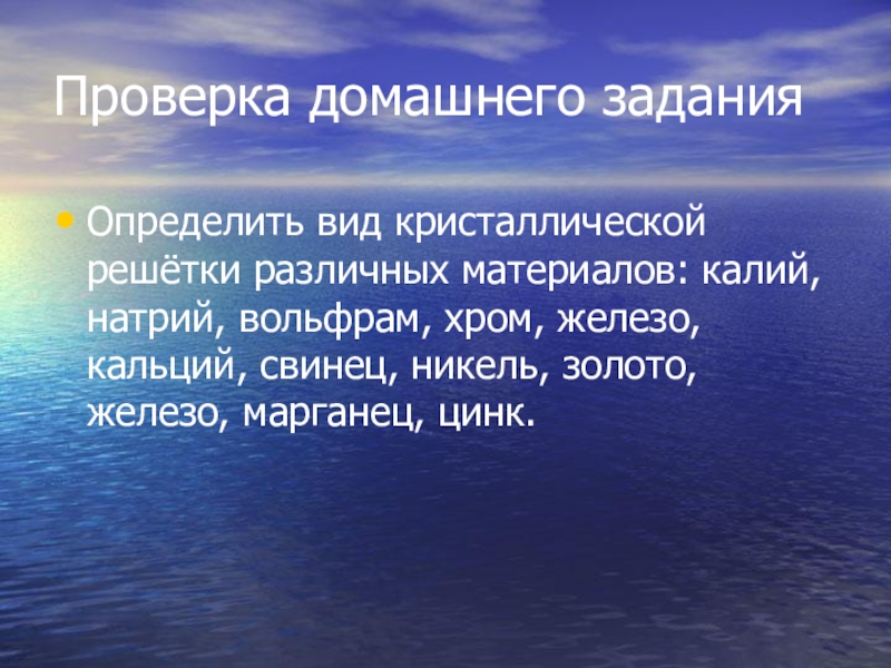 Проверка домашнего заданияОпределить вид кристаллической решётки различных материалов: калий, натрий, вольфрам, хром, железо, кальций, свинец, никель, золото,