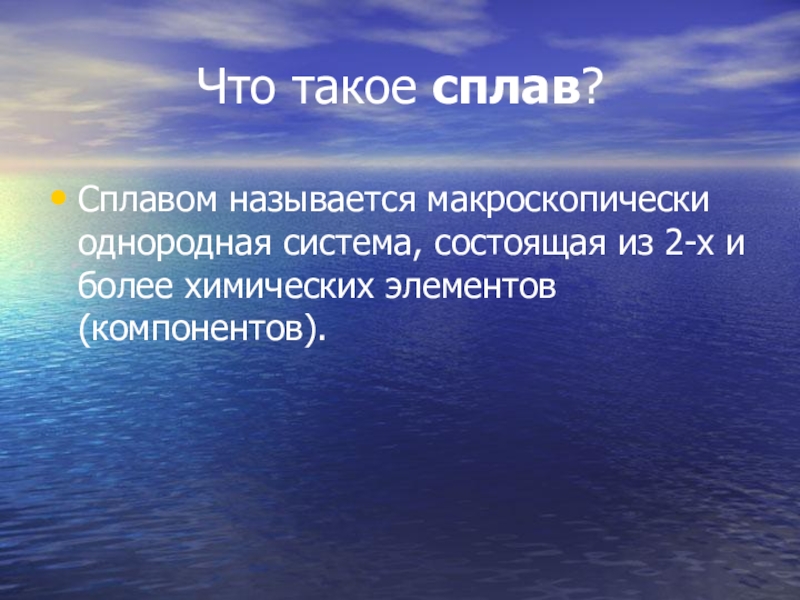 Что такое сплав?Сплавом называется макроскопически однородная система, состоящая из 2-х и более химических элементов (компонентов).