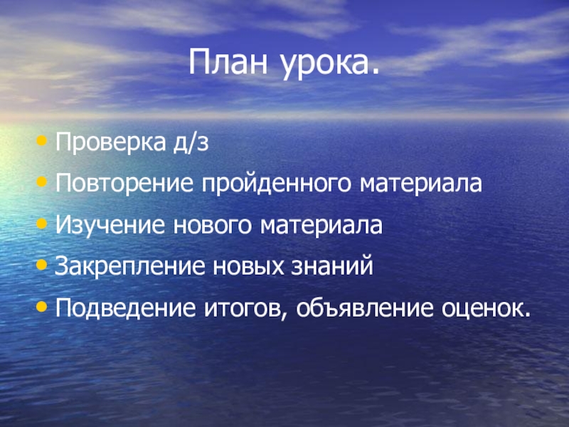 План урока.Проверка д/зПовторение пройденного материалаИзучение нового материалаЗакрепление новых знанийПодведение итогов, объявление оценок.