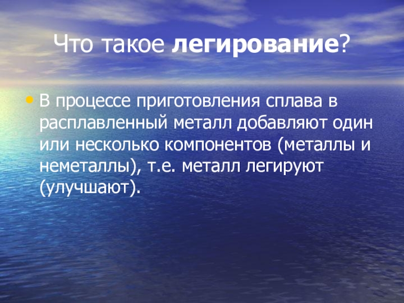 Что такое легирование?В процессе приготовления сплава в расплавленный металл добавляют один или несколько компонентов (металлы и неметаллы),