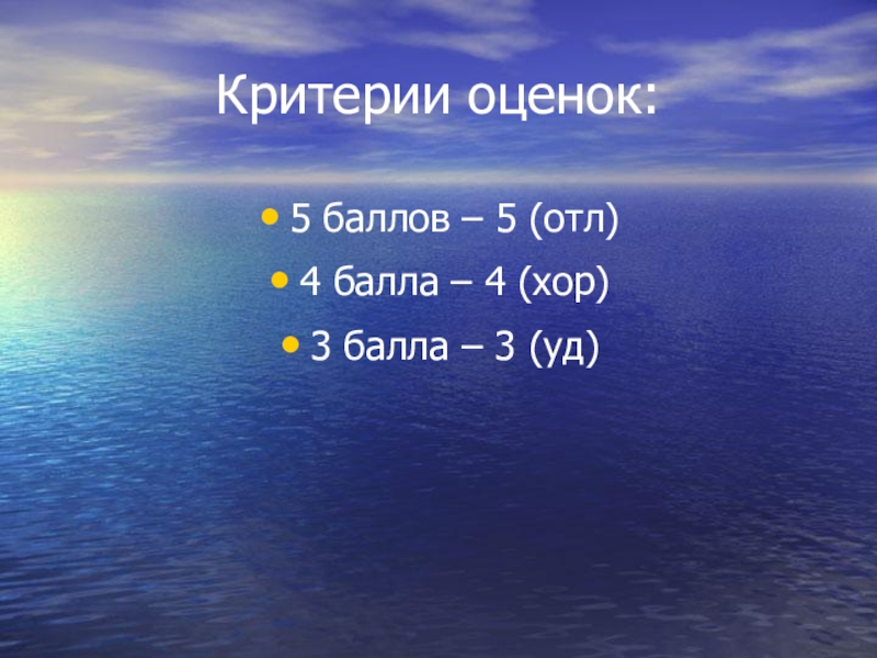 Критерии оценок:5 баллов – 5 (отл)4 балла – 4 (хор)3 балла – 3 (уд)
