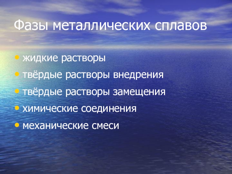 Фазы металлических сплавов жидкие растворы твёрдые растворы внедрения твёрдые растворы замещения химические соединения механические смеси