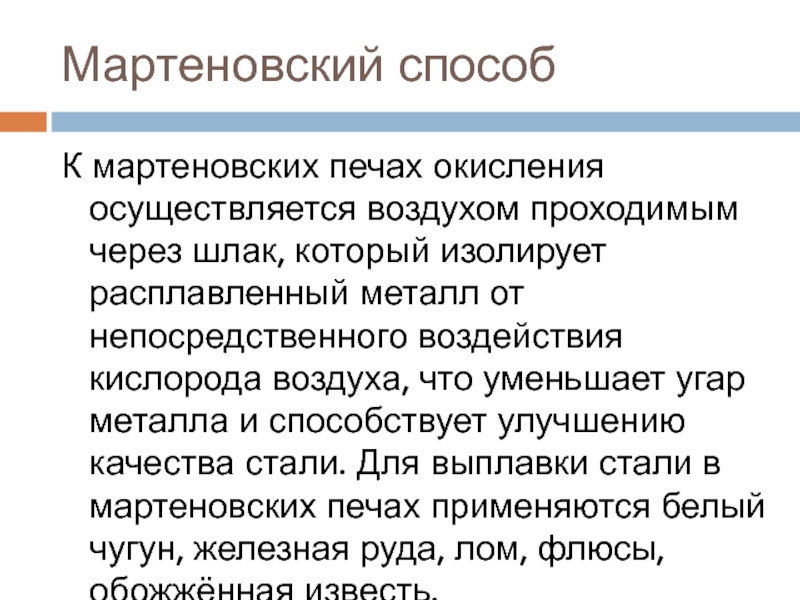 Мартеновский способК мартеновских печах окисления осуществляется воздухом проходимым через шлак, который изолирует расплавленный металл от непосредственного воздействия
