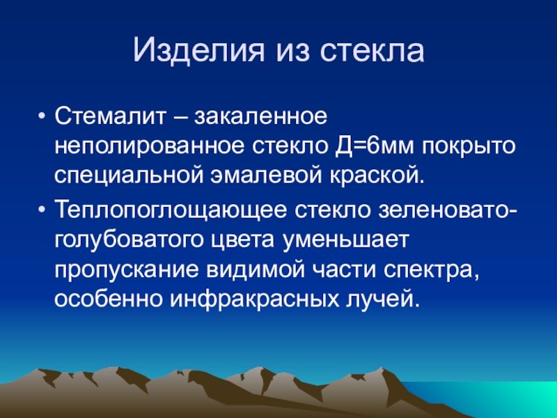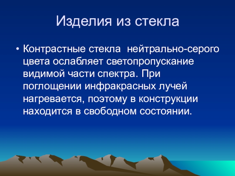 Теплопоглощающее стекло зеленовато-голубоватого цвета уменьшает пропускание видимой части спектра, особенно инфракрасных лучей.
