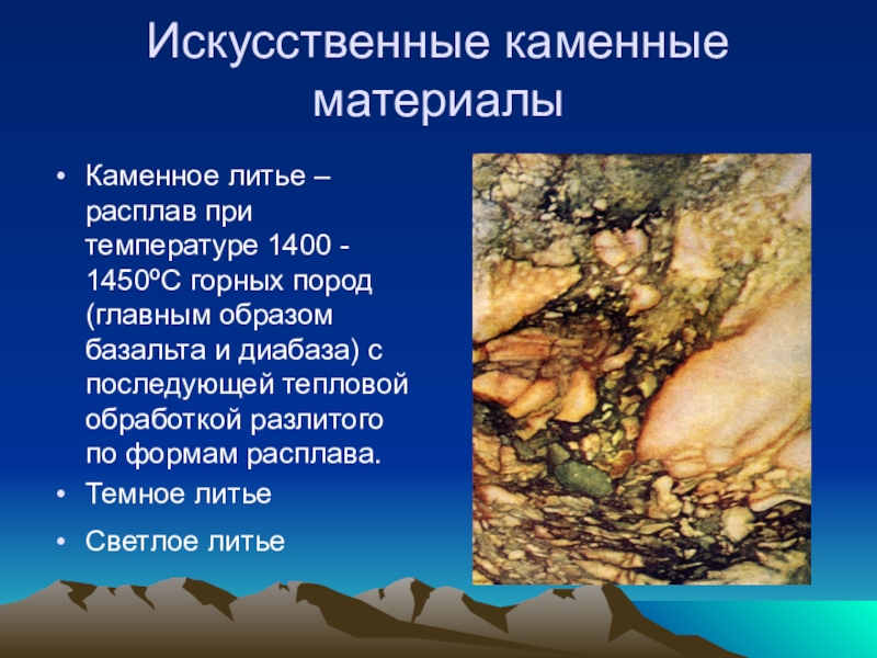 горных пород (главным образом базальта и диабаза) с последующей тепловой обработкой разлитого по формам расплава.