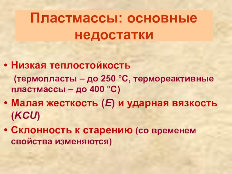 Пластмассы: основные недостаткиНизкая теплостойкость 	(термопласты – до 250 °С, термореактивные пластмассы – до 400 °С)Малая жесткость (E)