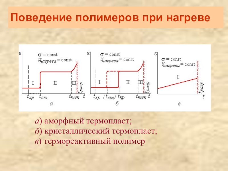 Поведение полимеров при нагреве				а) аморфный термопласт;		б) кристаллический термопласт;		в) термореактивный полимер
