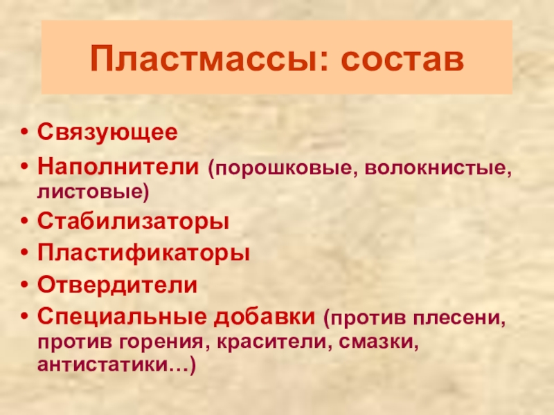 Пластмассы: составСвязующееНаполнители (порошковые, волокнистые, листовые)СтабилизаторыПластификаторыОтвердителиСпециальные добавки (против плесени, против горения, красители, смазки, антистатики…)