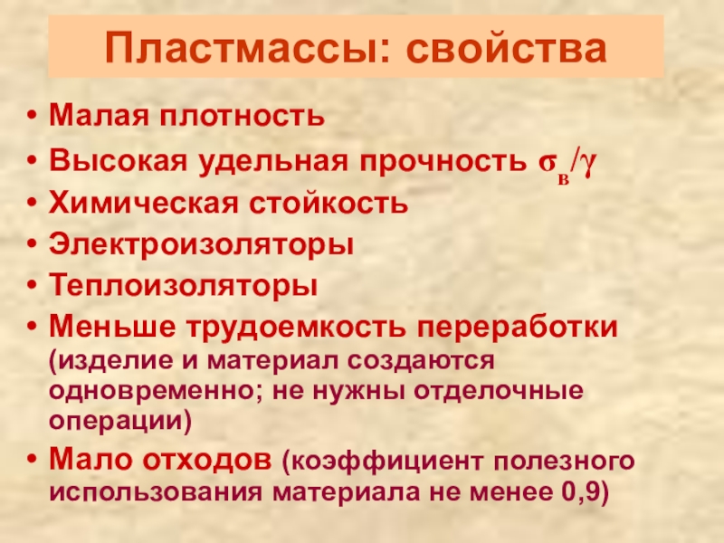 Пластмассы: свойстваМалая плотностьВысокая удельная прочность σв/γ Химическая стойкостьЭлектроизоляторыТеплоизоляторыМеньше трудоемкость переработки (изделие и материал создаются одновременно; не нужны