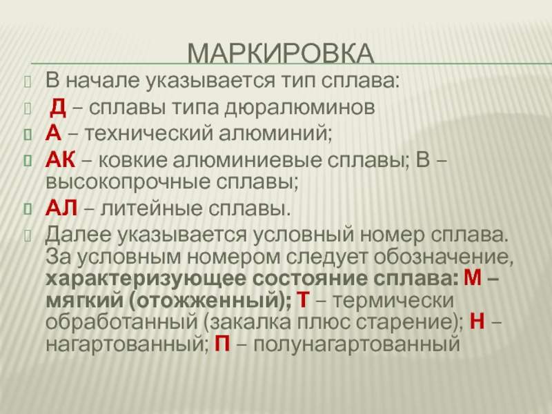 Далее указывается условный номер сплава. За условным номером следует обозначение, характеризующее состояние сплава: М – мягкий (отожженный); Т – термически обработанный (закалка плюс старение); Н – нагартованный; П – полунагартованный