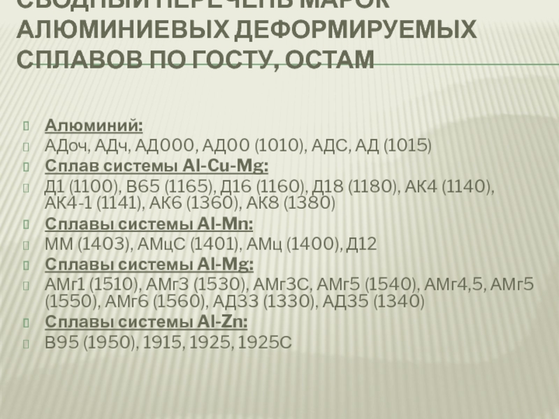 Слайд 25Сводный перечень марок алюминиевых деформируемых сплавов по ГОСТу, ОСТам