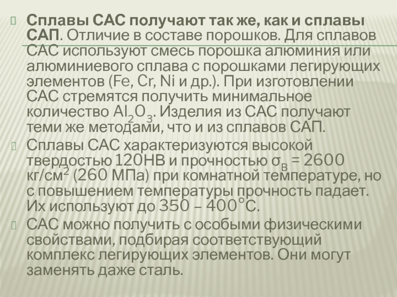 составе порошков. Для сплавов САС используют смесь порошка алюминия или алюминиевого сплава с порошками легирующих элементов (Fe, Cr, Ni и др.). При изготовлении САС стремятся получить минимальное количество Al2O3. Изделия из САС получают теми же методами, что и из сплавов САП.