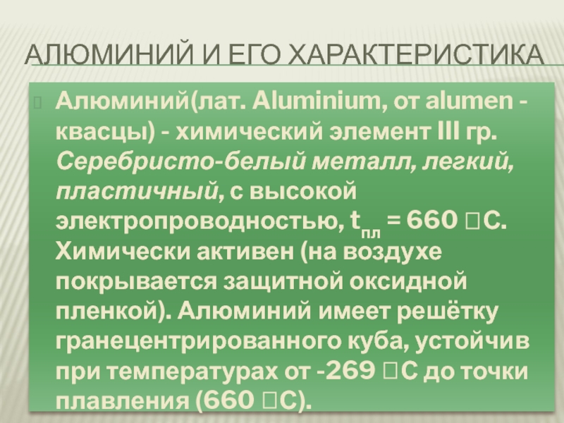 элемент III гр.Серебристо-белый металл, легкий, пластичный, с высокой электропроводностью, tпл = 660 С. Химически активен (на воздухе покрывается защитной оксидной пленкой). Алюминий имеет решётку гранецентрированного куба, устойчив при температурах от -269 С до точки плавления (660 С).
