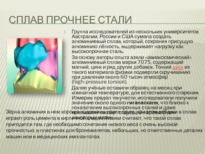 Зёрна алюминия в нем хорошо подогнаны друг к другу, при этом добавки в сплав играют роль цемента в кирпичной кладке Физики считают, что такой сплав пригодится там, где необходимо сочетание низкого веса с очень высокой прочностью: в пластинах для бронежилетов, небольших, но ответственных деталях машин или в медицинских имплантатах.