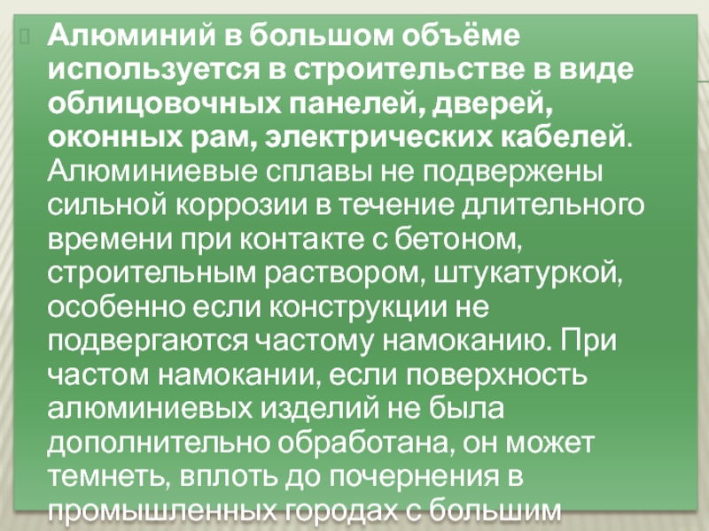 дверей, оконных рам, электрических кабелей. Алюминиевые сплавы не подвержены сильной коррозии в течение длительного времени при контакте с бетоном, строительным раствором, штукатуркой, особенно если конструкции не подвергаются частому намоканию. При частом намокании, если поверхность алюминиевых изделий не была дополнительно обработана, он может темнеть, вплоть до почернения в промышленных городах с большим содержанием окислителей в воздухе.