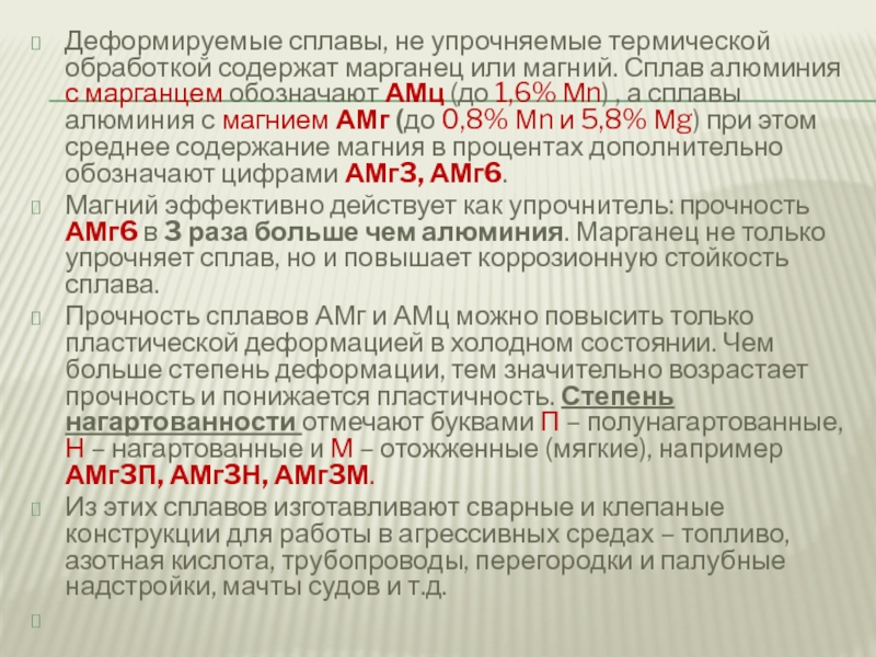 Слайд 19Деформируемые сплавы, не упрочняемые термической обработкой содержат марганец или магний. Сплав