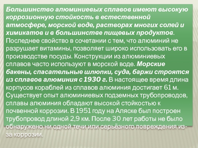 воде, растворах многих солей и химикатов и в большинстве пищевых продуктов. Последнее свойство в сочетании с тем, что алюминий не разрушает витамины, позволяет широко использовать его в производстве посуды. Конструкции из алюминиевых сплавов часто используют в морской воде. Морские бакены, спасательные шлюпки, суда, баржи строятся из сплавов алюминия с 1930 г. В настоящее время длина корпусов кораблей из сплавов алюминия достигает 61 м. Существует опыт алюминиевых подземных трубопроводов, сплавы алюминия обладают высокой стойкостью к почвенной коррозии. В 1951 году на Аляске был построен трубопровод длиной 2,9 км. После 30 лет работы не было обнаружено ни одной течи или серьёзного повреждения из-за коррозии.