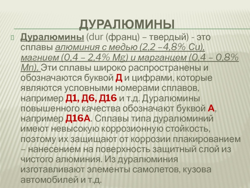 –4,8% Сu), магнием (0,4 – 2,4% Мg) и марганцем (0,4 – 0,8% Мn). Эти сплавы широко распространены и обозначаются буквой Д и цифрами, которые являются условными номерами сплавов, например Д1, Д6, Д16 и т.д. Дуралюмины повышенного качества обозначают буквой А, например Д16А. Сплавы типа дуралюминий имеют невысокую коррозионную стойкость, поэтому их защищают от коррозии плакированием – нанесением на поверхность защитный слой из чистого алюминия. Из дуралюминия изготавливают элементы самолетов, кузова автомобилей и т.д.