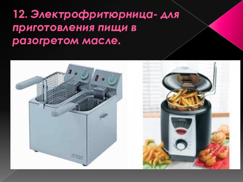 Слайд 2712. Электрофритюрница- для приготовления пищи в разогретом масле.