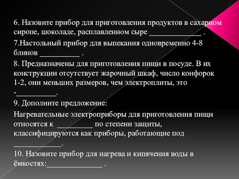 10. Назовите прибор для нагрева и кипячения воды в ёмкостях:______________ .