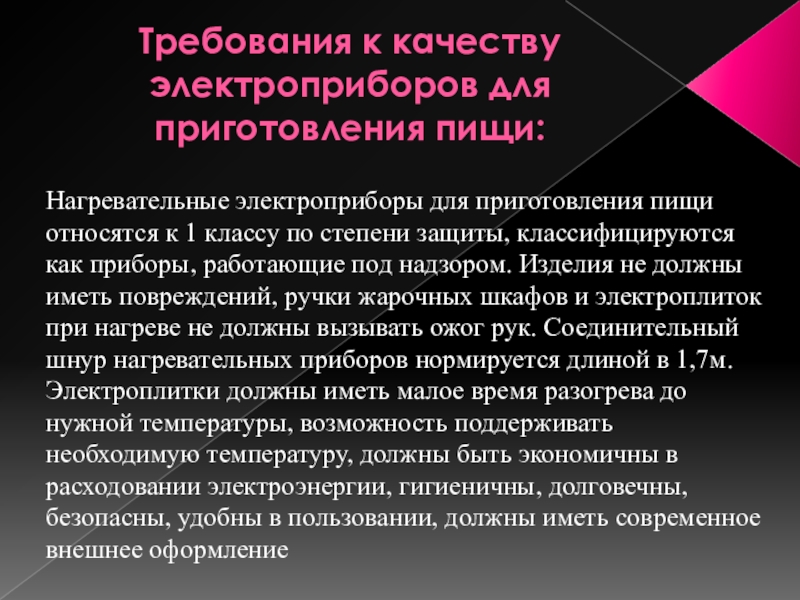 Слайд 36Требования к качеству электроприборов для приготовления пищи: