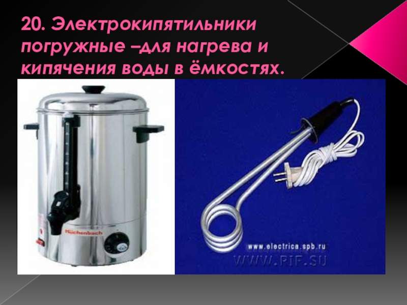 Слайд 3520. Электрокипятильники погружные –для нагрева и кипячения воды в ёмкостях.