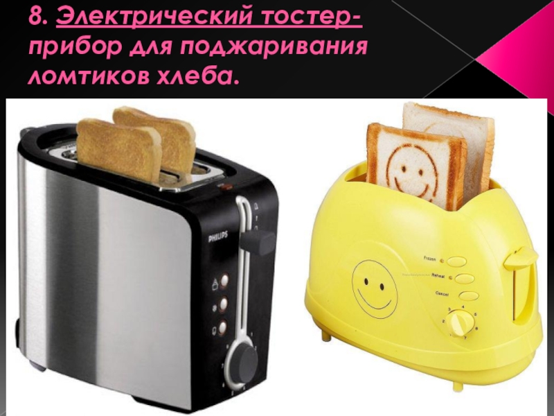 Слайд 228. Электрический тостер- прибор для поджаривания ломтиков хлеба.