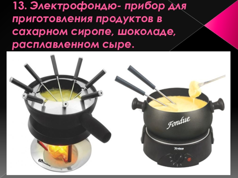 Слайд 2813. Электрофондю- прибор для приготовления продуктов в сахарном сиропе, шоколаде, расплавленном