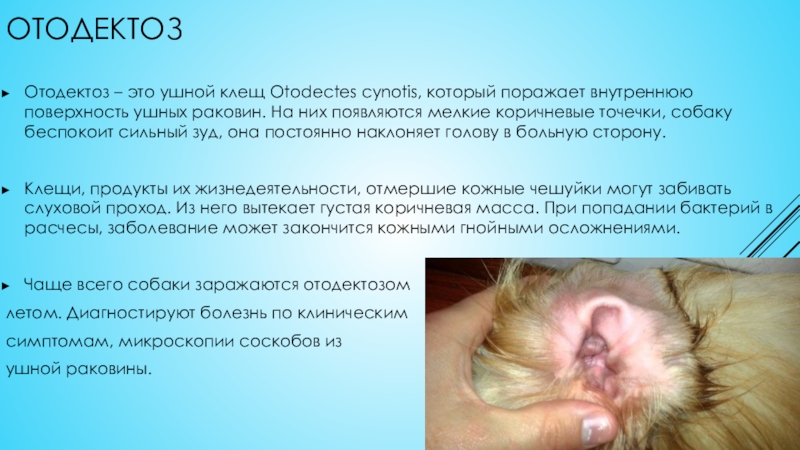 ушных раковин. На них появляются мелкие коричневые точечки, собаку беспокоит сильный зуд, она постоянно наклоняет голову в больную сторону.