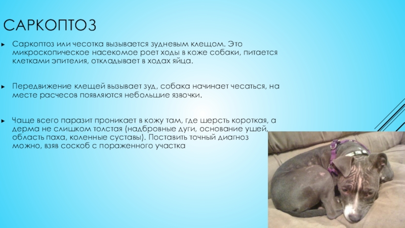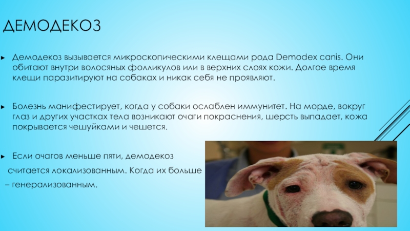 фолликулов или в верхних слоях кожи. Долгое время клещи паразитируют на собаках и никак себя не проявляют.