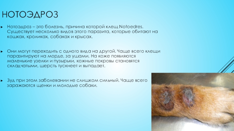 Они могут переходить с одного вида на другой. Чаще всего клещи паразитируют на морде, за ушами. На коже появляются маленькие узелки и пузырьки, кожные покровы становятся складчатыми, шерсть тускнеет и выпадает.