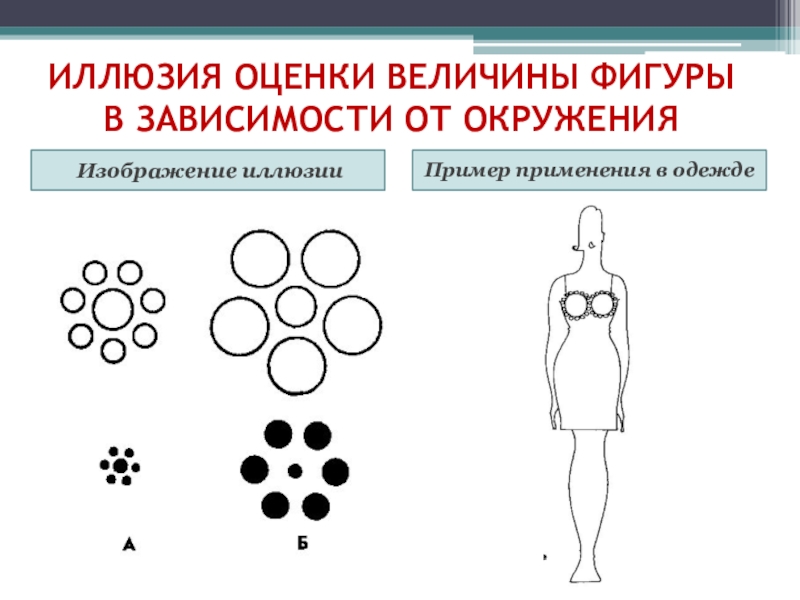 ИЛЛЮЗИЯ ОЦЕНКИ ВЕЛИЧИНЫ ФИГУРЫ В ЗАВИСИМОСТИ ОТ ОКРУЖЕНИЯИзображение иллюзииПример применения в одежде
