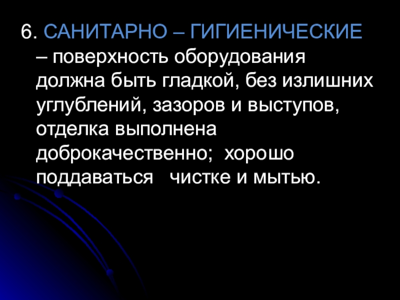Слайд 116. САНИТАРНО – ГИГИЕНИЧЕСКИЕ – поверхность оборудования должна быть гладкой, без