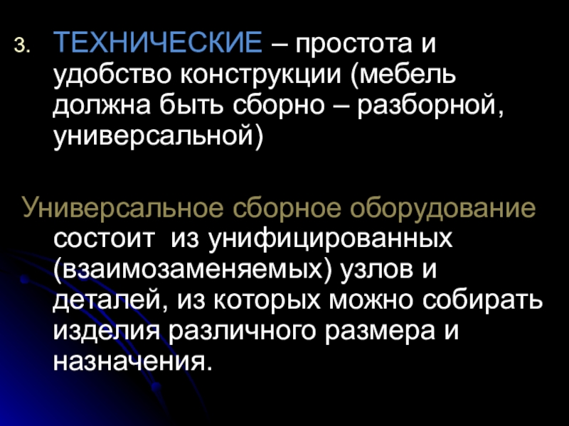 Слайд 8ТЕХНИЧЕСКИЕ – простота и удобство конструкции (мебель должна быть сборно –