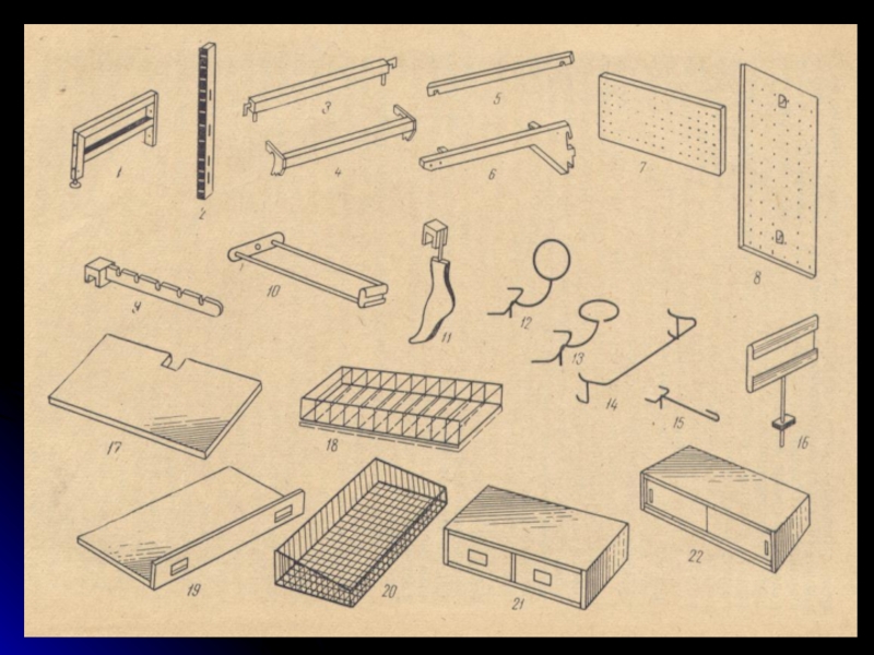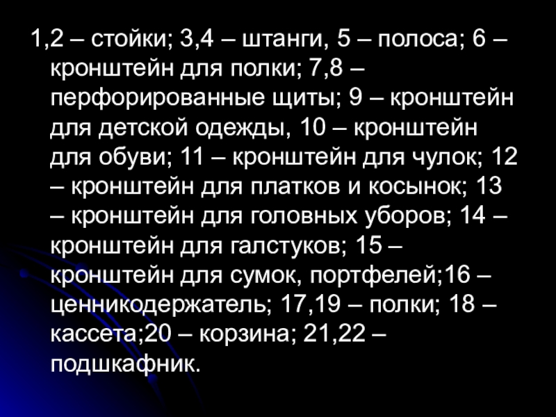кронштейн для полки; 7,8 – перфорированные щиты; 9 – кронштейн для детской одежды, 10 – кронштейн для обуви; 11 – кронштейн для чулок; 12 – кронштейн для платков и косынок; 13 – кронштейн для головных уборов; 14 – кронштейн для галстуков; 15 – кронштейн для сумок, портфелей;16 – ценникодержатель; 17,19 – полки; 18 – кассета;20 – корзина; 21,22 – подшкафник.