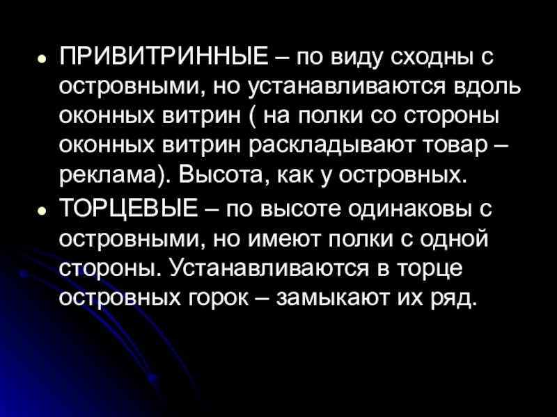 Слайд 25ПРИВИТРИННЫЕ – по виду сходны с островными, но устанавливаются вдоль оконных