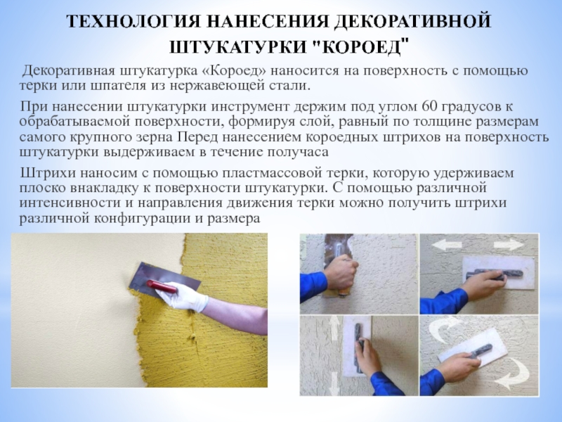 Слайд 6ТЕХНОЛОГИЯ НАНЕСЕНИЯ ДЕКОРАТИВНОЙ ШТУКАТУРКИ "КОРОЕД"