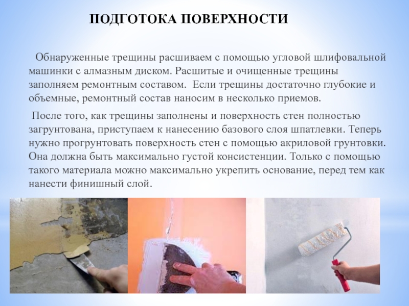 ПОДГОТОКА ПОВЕРХНОСТИ   Обнаруженные трещины расшиваем с помощью угловой шлифовальной машинки с алмазным диском. Расшитые и
