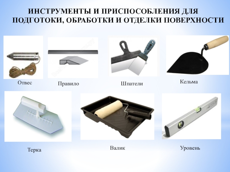 ИНСТРУМЕНТЫ И ПРИСПОСОБЛЕНИЯ ДЛЯ ПОДГОТОКИ, ОБРАБОТКИ И ОТДЕЛКИ ПОВЕРХНОСТИОтвесПравилоШпателиКельмаТеркаВаликУровень