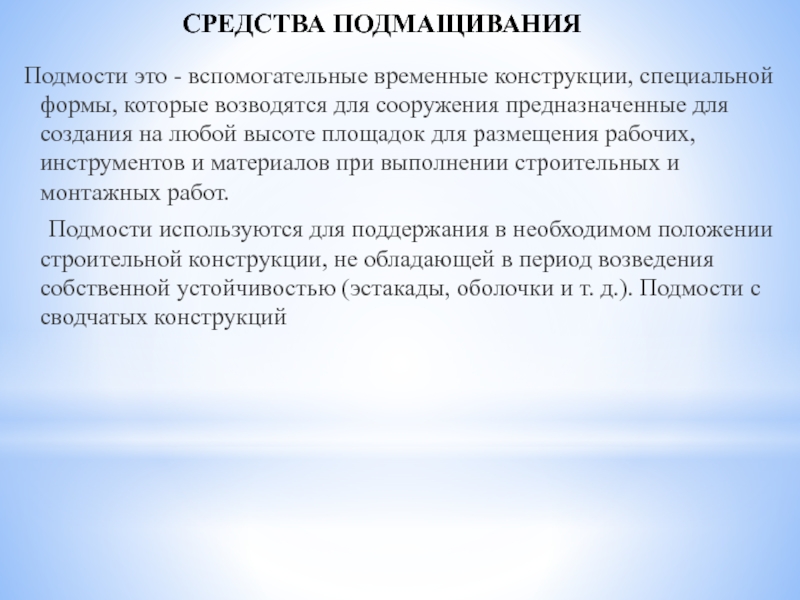 СРЕДСТВА ПОДМАЩИВАНИЯ Подмости это - вспомогательные временные конструкции, специальной формы, которые возводятся для сооружения предназначенные для создания на