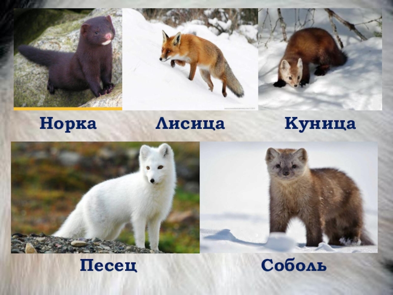 Зимний периодХорекЕнотШкурки белкиЗаяц – белякНутрияОндатраРечной бобрШакалБелый и голубой песецЕнот ВолкКуницаЛисицаЛеопардВыдраХоря и др.