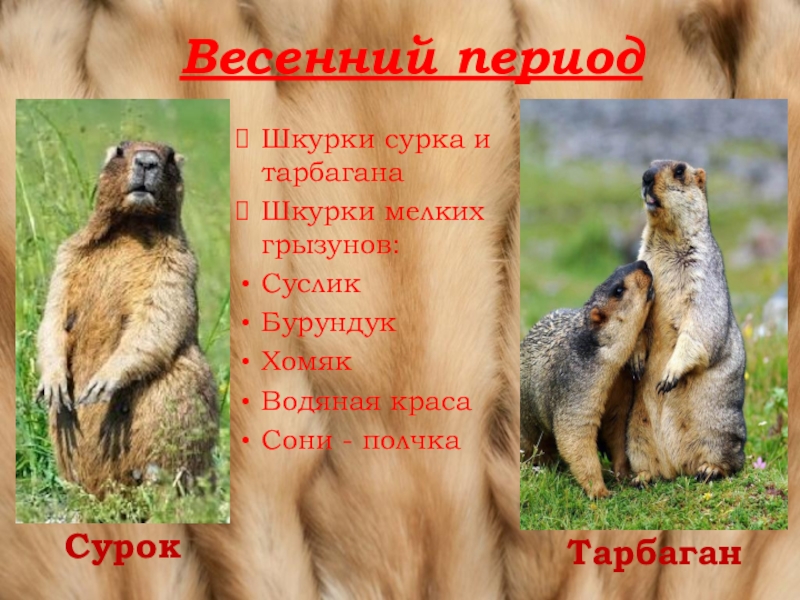 Весенний периодТарбаганШкурки сурка и тарбаганаШкурки мелких грызунов:СусликБурундукХомяк Водяная красаСони - полчкаСурок