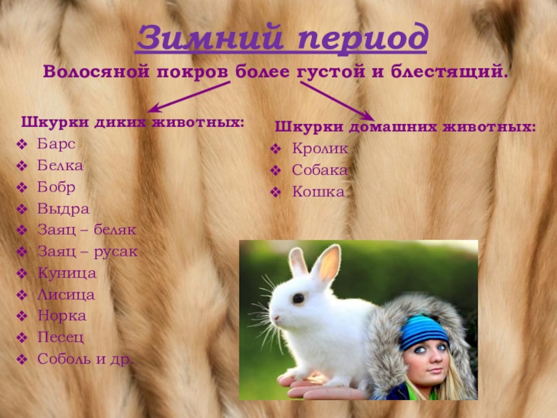 Зимний периодВолосяной покров более густой и блестящий. Шкурки домашних животных:КроликСобакаКошкаШкурки диких животных:БарсБелкаБобрВыдра Заяц – белякЗаяц – русак