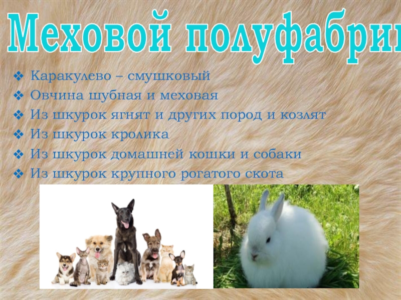 Меховой полуфабрикатКаракулево – смушковыйОвчина шубная и меховаяИз шкурок ягнят и других пород и козлятИз шкурок кроликаИз шкурок