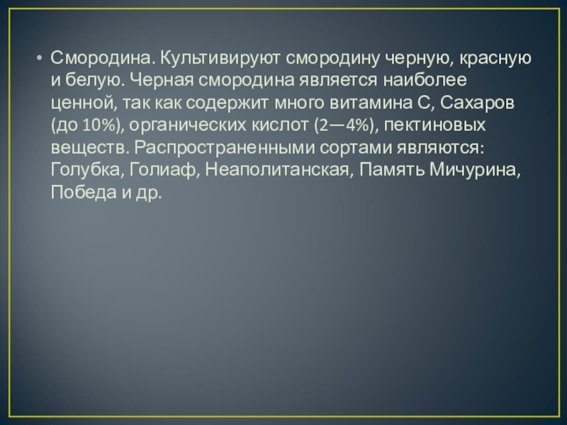 ценной, так как содержит много витамина С, Сахаров (до 10%), органических кислот (2—4%), пектиновых веществ. Распространенными сортами являются: Голубка, Голиаф, Неаполитанская, Память Мичурина, Победа и др.